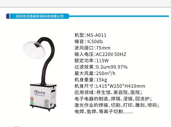 艾灸养生馆去烟去味净化器激光烟雾排烟机:艾灸除烟去味净化设备是一款净化艾灸时产生的烟雾、异味、有毒有害气体的设备。其外观时尚、体积轻小、静音、省电环保,对烟雾吸收净化率可达到,配有双吸烟管道,吸烟管道可自由伸缩长短,吸烟角度可360度灵活调整,内置双层异味细菌过滤材料。